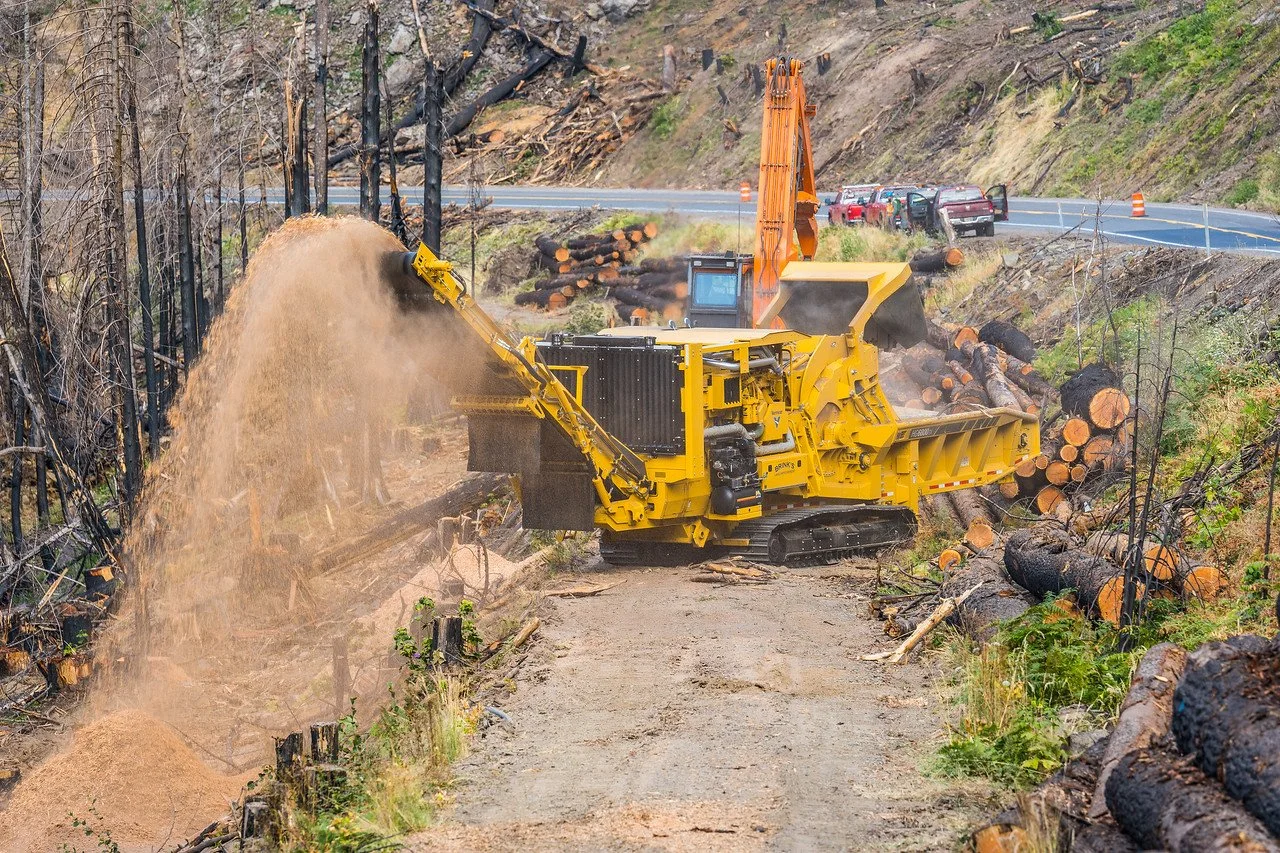 The HG6800 horizontal grinder is powered by a 965 horsepower CAT engine and is capable of running through an enormous amount of material. Its is fed by our log loaders with brush grapples, or fixed grapple excavator to maximize production. It’s best suited for large slash pile projects, storm damage, land clearing or similar projects with a high volume of material to grind. It is capable of grinding dirty slash, stumps and similar into various sizes depending on customer specifications. Material can be ground and spread on-site or hauled away in chip vans depending on site requirements.